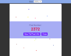 The idea is that the user clicks on a white pixel on the square, chooses a colour, and saves it, along with some information about themself and a personal message for the world - leaving behind a coloured pixel to represent their entry. Anyone clicking on a claimed pixel - assisted by the handy magnification function! - is able to view the user’s information and message. I added extra functionality to stop users from over-writing claimed pixels, and also barred used from selecting white (the default) as their colour.