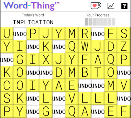 I had a lot of fun making this. It was a marathon of problem-solving through sheer necessity, and I feel that I became a better Javascript developer as I brought my ideas to life. Every day I would think of a new feature, and I would quickly think of a way to make it happen. (An unseen supporting feature is the mini Javascript project I made, hosted locally, to help me to set the games - an onscreen interactive grid that creates the required arrays of winning letters, index numbers and randomised filler-letters that make-up the game's data.)